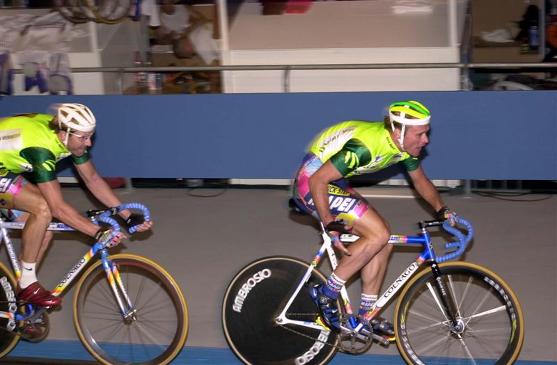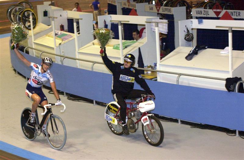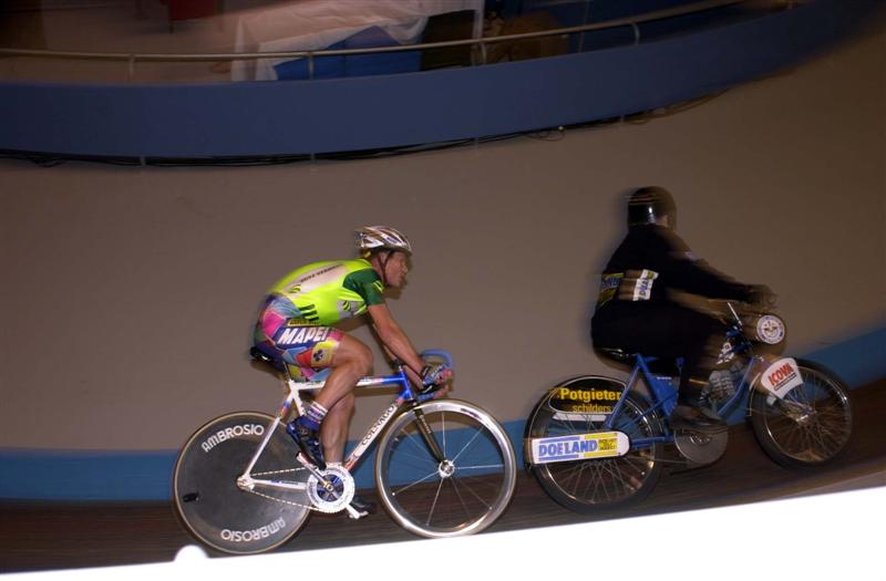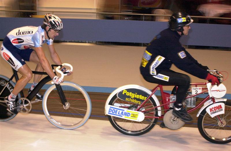 Gilmore tucks in behind the Derny (here behind Joop Zijlaard)