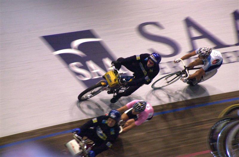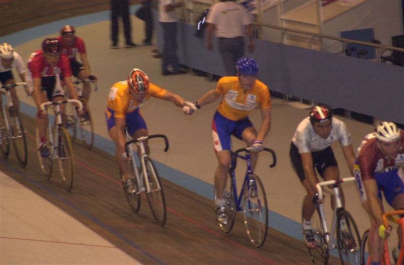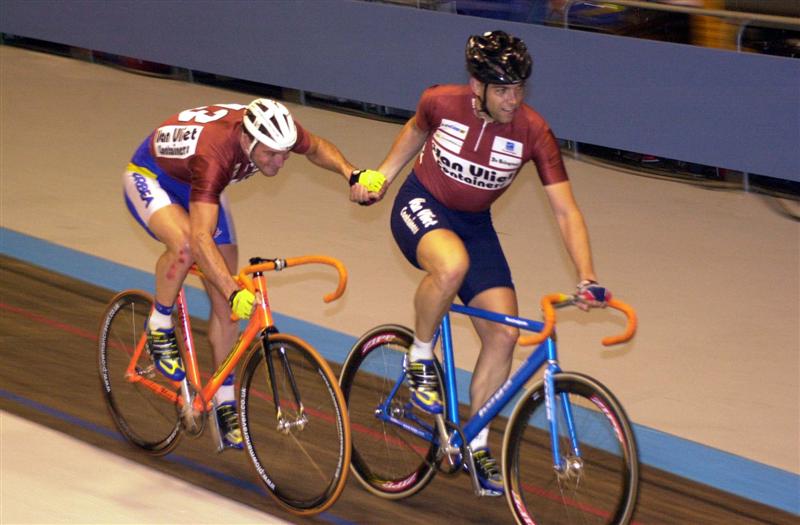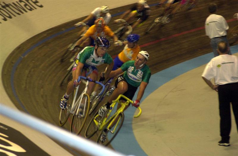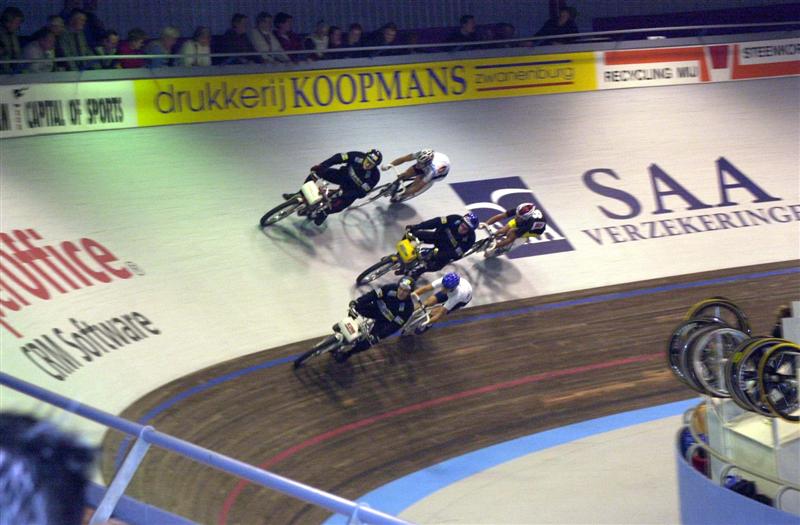 all round as Servais Knaven leads Leon Van Bon into a flying 500m