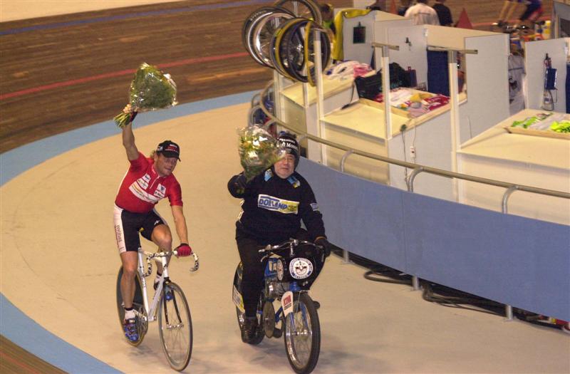 and his pacer Sam Mooij celebrate victory in the evening's Derny competition.