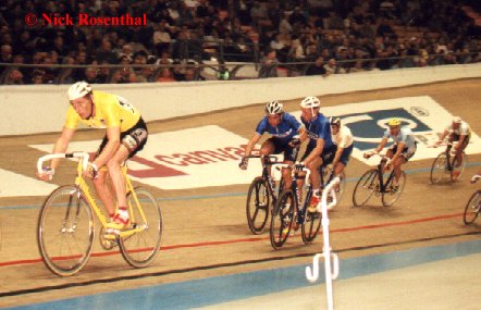 Danish six-day pro cyclists Jimmi Madsen and Tayeb Braikia pictured during the 1998 Ghent six-day cycle race. Both ride for the Danish Acceptcard team, and they paired up for the first part of the 1998-99 season after both their regular six-day partners were sidelined by injury. Madsen's partner Jens Veggerby is out due to complications with a broken collar bone sustained during a confrontation with a car (the car won), whilst Braikia's partner Jakob Piil had to take a few months off with a hip injury. Piil hopes to be back in competition in time for the 1999 Berlin 6 day race.